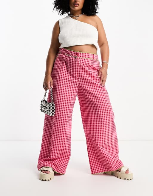 Neon Rose Plus rick-rack detail wide leg gingham pants in pink
