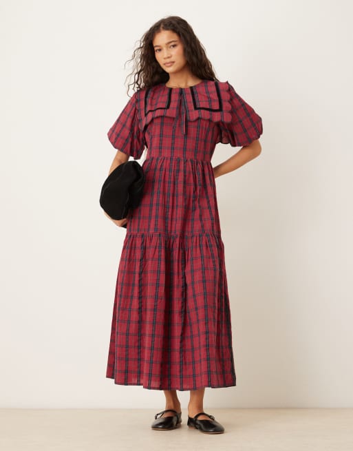 Neon Rose collar detail tiered midaxi dress in burgundy plaid