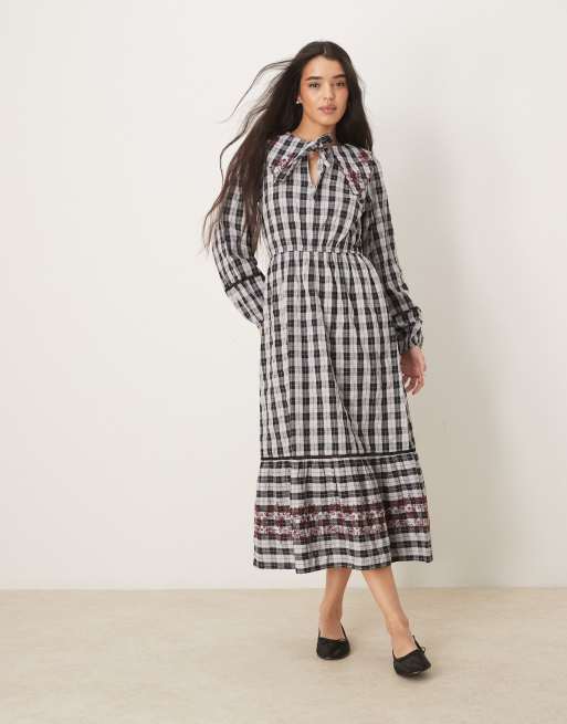 Neon Rose mutton sleeve smock midaxi dress in gray gingham