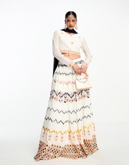 Nesavaali lehenga embroidered long sleeve crop top, maxi skirt and dupatta set