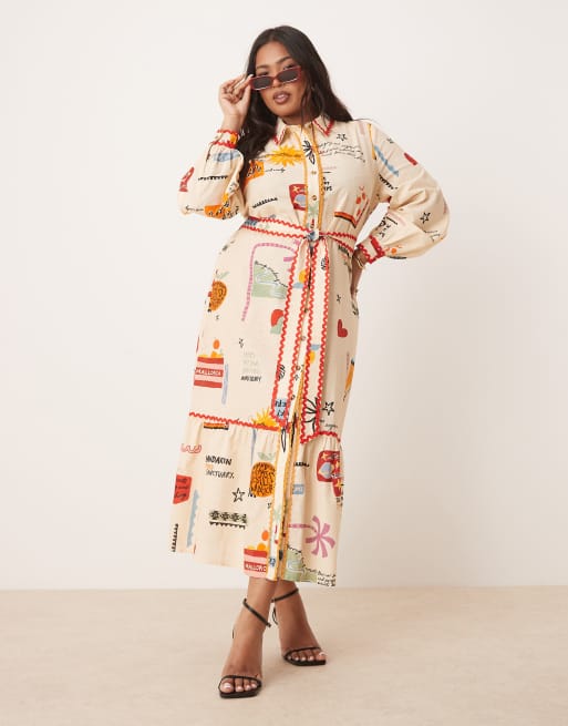 Never Fully Dressed Plus belted shirt midaxi dress in cream print