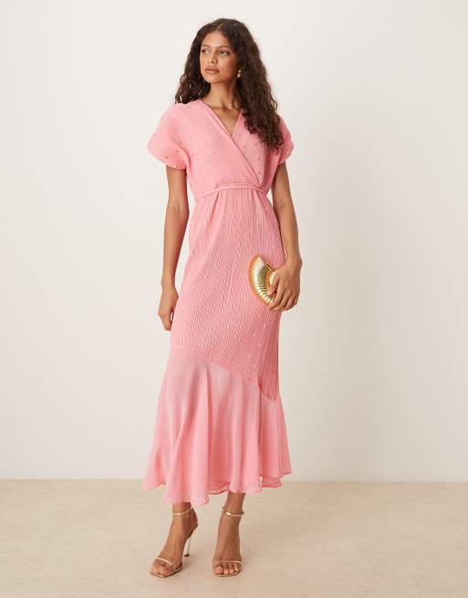 Never Fully Dressed asymmetric dropped hem plisse midaxi dress in bright pink
