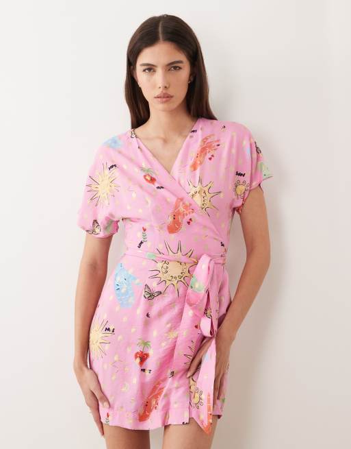 Never Fully Dressed short sleeve tie detail wrap mini dress in pink celestial print