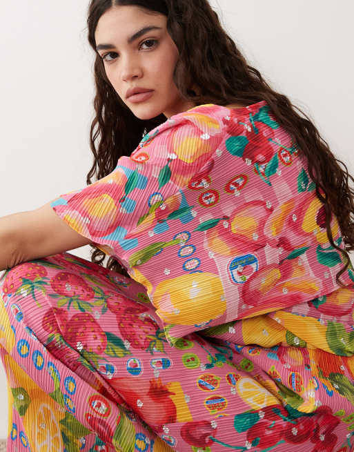 Never Fully Dressed Tilly off shoulder plisse maxi dress in pink fruit print