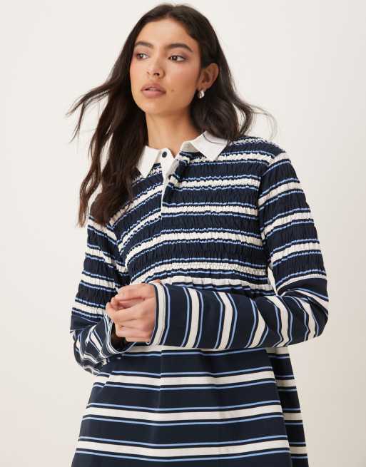 NIA Barrington shirred striped collared polo top in navy