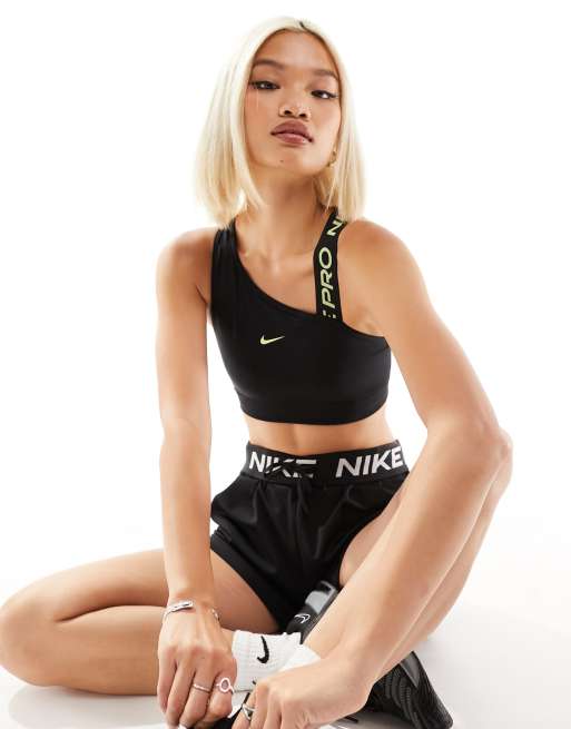 Nike Pro Training swoosh asymmetric sports bra in black and yellow