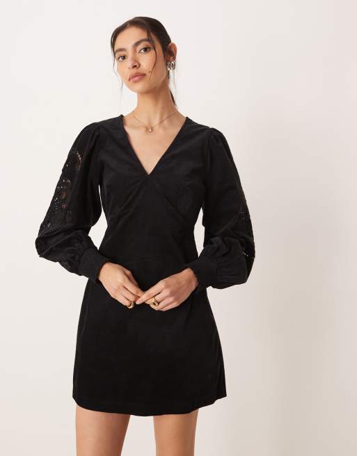 Nobody's Child Bree corduroy cutwork balloon sleeve v-neck mini dress in black