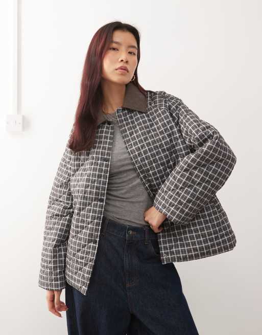 Noisy May quilted plaid jacket in brown
