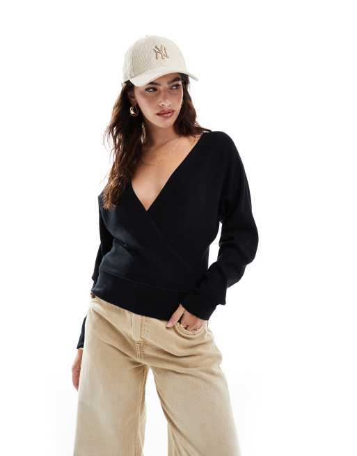 Object low V-neck wrap front sweater in black
