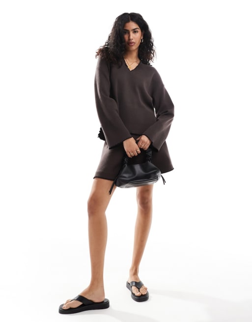 Object oversized v neck sweater and knitted skater skirt set with contrast trim