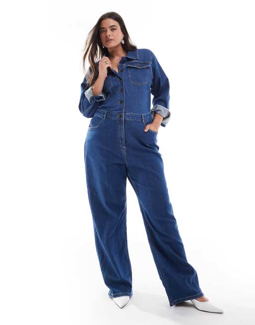 ONLY Curve long sleeve denim jumpsuit in dark blue