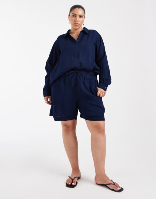 ONLY Curve seersucker shirt & shorts set in dark blue