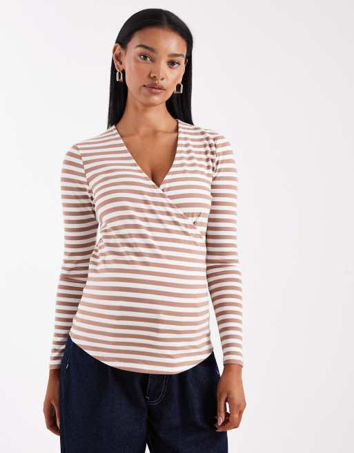 ONLY Maternity wrap top in white and brown stripe