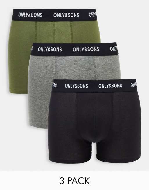 Only & Sons 3 pack trunks with contrast waistband in black, khaki and gray