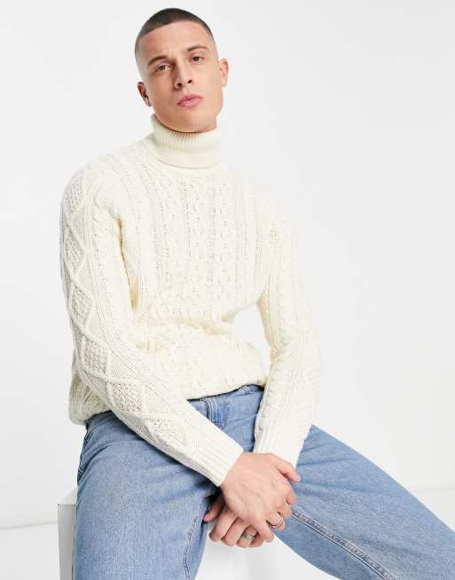 Only & Sons chunky cable knit roll neck sweater in white