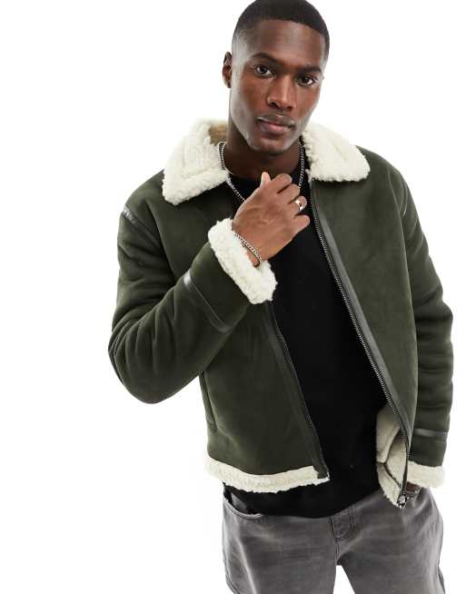 Only & Sons faux suede aviator jacket with borg lining in khaki