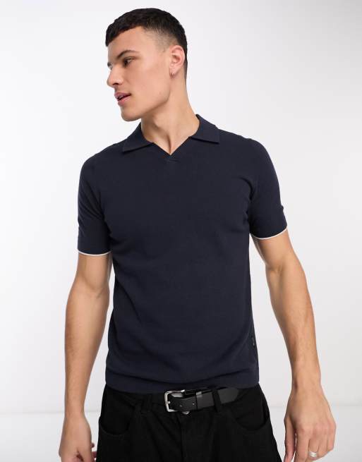 Only & Sons knitted polo with revere collar in navy