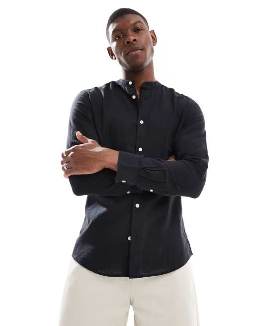 ONLY & SONS linen mix stand collar shirt in black