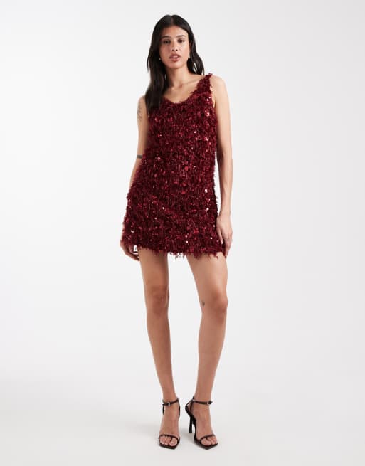 ONLY Tall faux feathers sequined mini dress in burgundy