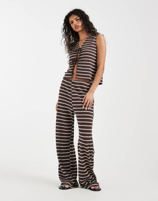 ONLY knit tie front top & wide leg pants set in brown stripe