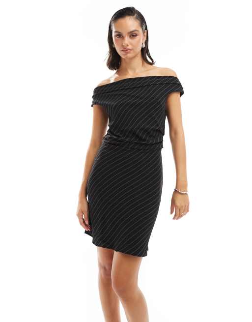 ONLY off shoulder mini dress in black pinstripe