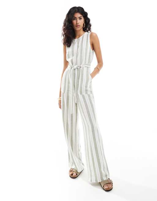 Only sleeveless belted linen mix jumpsuit in cream and sage stripe