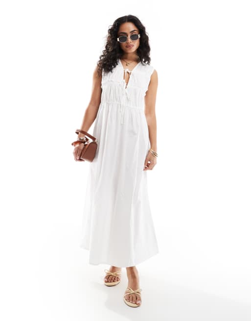 ONLY tie front ruched cotton midaxi dress in white