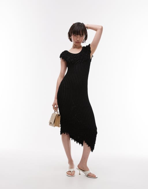 & Other Stories knit midi dress with fringed neckline and hem in black
