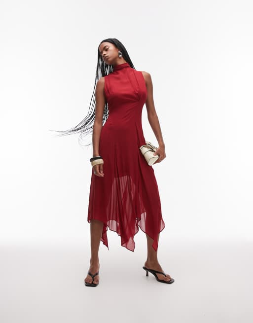 & Other Stories layered sheer chiffon midaxi dress with open tie back and handkerchief hem in red