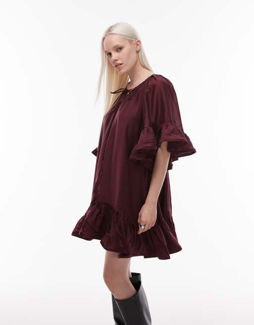 & Other Stories semi sheer mini dress with ruffle edge sleeves and tie neck in burgundy