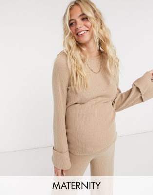 Pieces Maternity ribbed top & wide leg pants set in camel