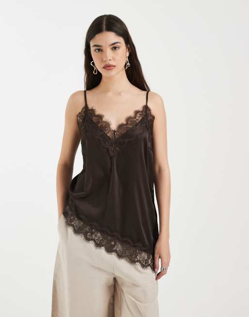 PIECES asymmetric lace trim satin cami top in chocolate brown