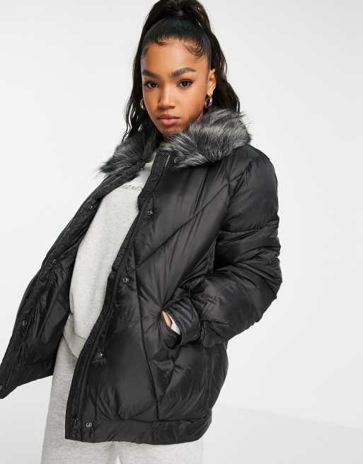 Pieces faux fur collar puffer jacket in black