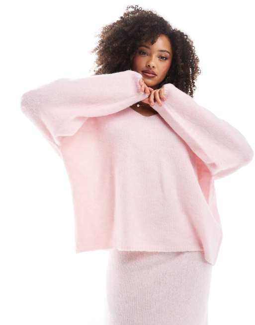Pieces fluffy oversized v neck sweater in pink - part of a set
