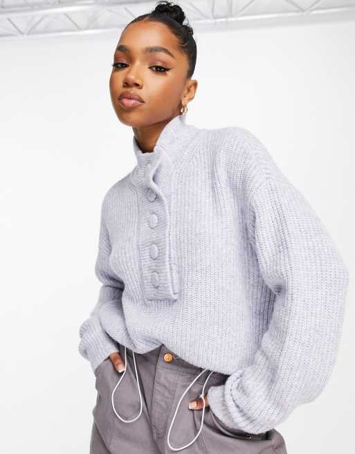 Pieces textured high neck button detail sweater in blue heather