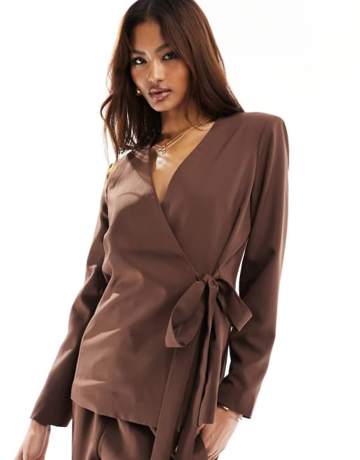 Pieces wrap front blazer and formal woven jogger co-ord in chocolate brown