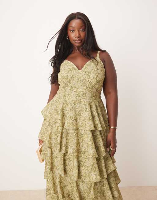 Pretty Lavish Curve tie back ruffle midaxi dress in olive floral