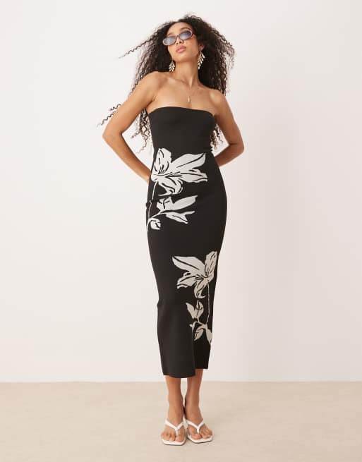 Pretty Lavish Milena bandeau flower midaxi knit dress in black and cream