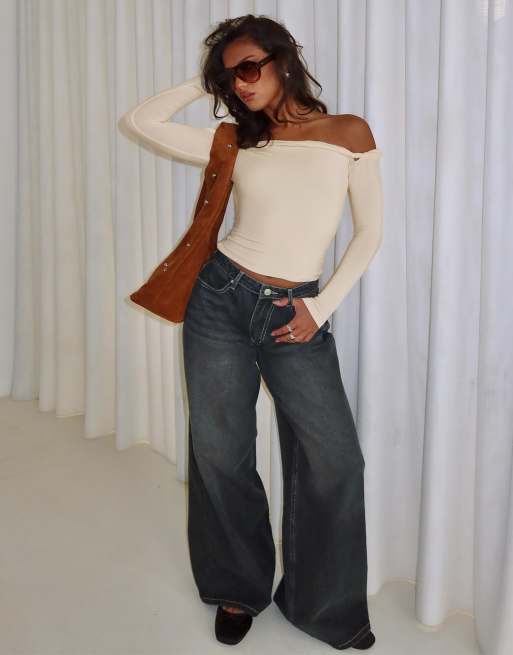 Princess Polly Naylor cotton rich wide leg slouch jeans in dark gray wash