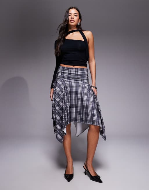 Princess Polly Scholar ruched waist asymmetric hem midi skirt in gray plaid