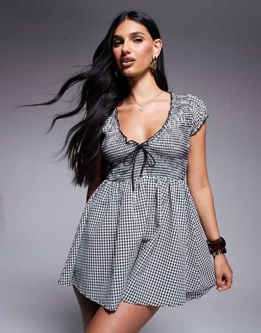 Princess Polly Wescott shirred detail tie front romper in black & white gingham