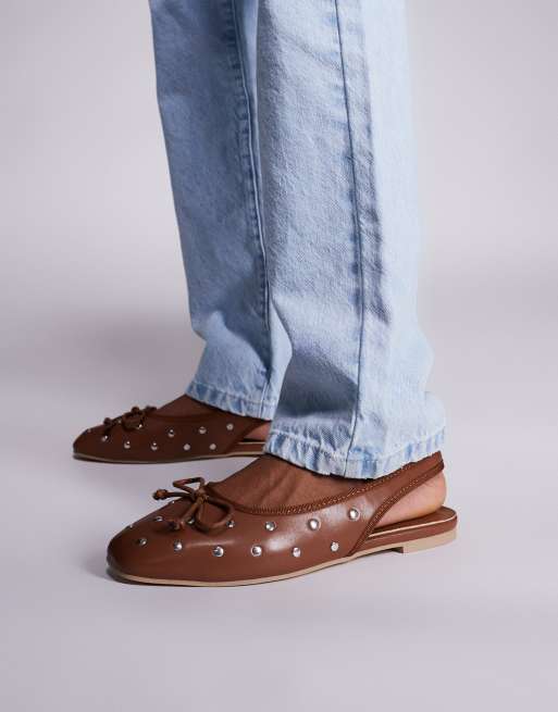 Public Desire Bia sling back ballet flats with flat studs in Brown
