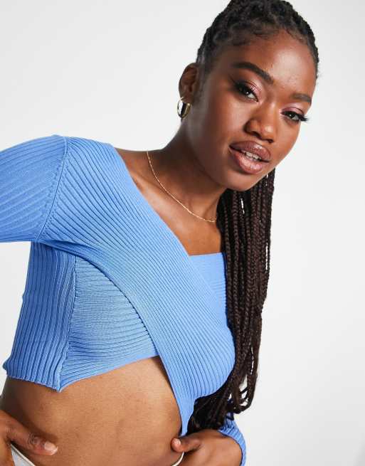 Pull&Bear bandage front cropped long sleeve knitted top in blue