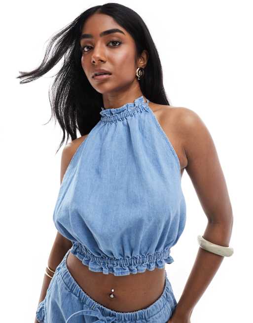 Pull&Bear ruched halterneck denim top in light blue - part of a set