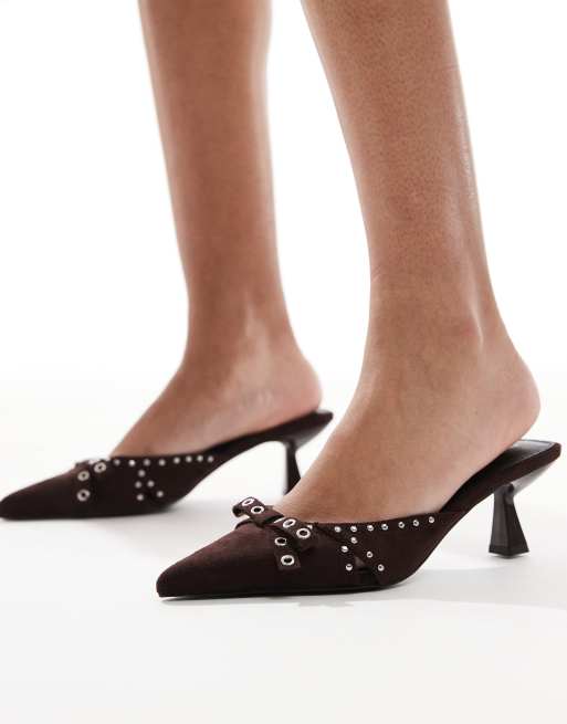 RAID Tinsley kitten heeled mules with bows in chocolate
