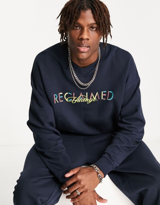 Reclaimed Vintage Inspired 90s navy sweatpants & sweatshirt set with logo embroidery