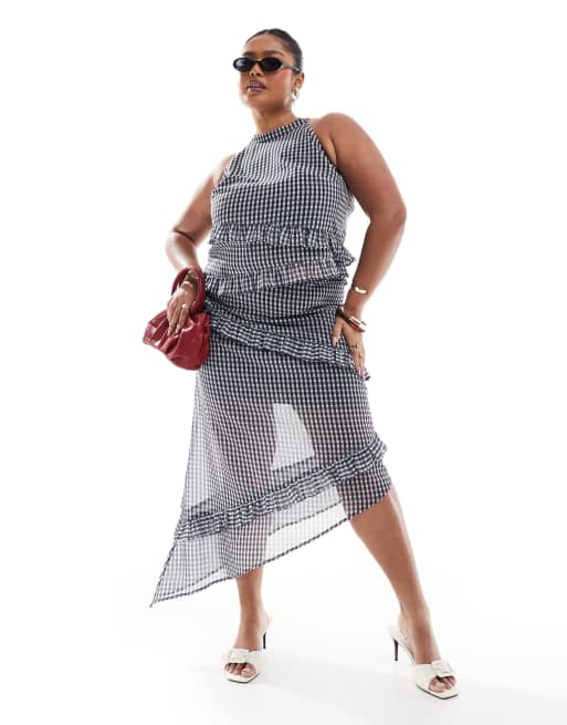 Renee Studio exclusive asymmetric ruffle trim midi skirt in gray check - part of a set