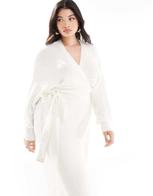 River Island Plus wrap belted knit midi dress in cream
