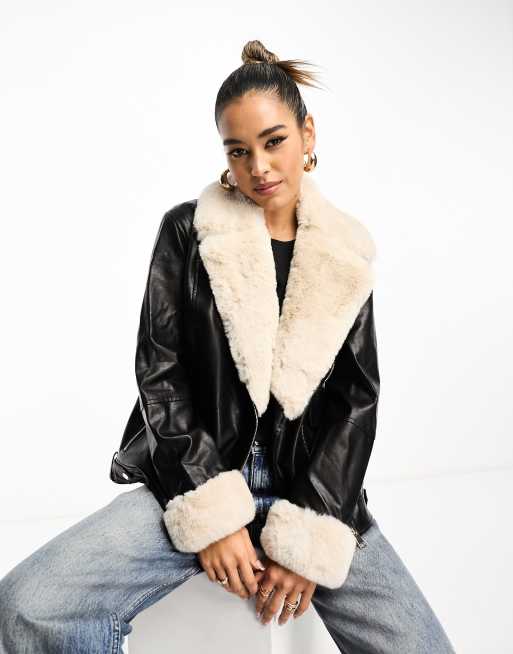 River Island biker jacket with contrast faux fur detail in black