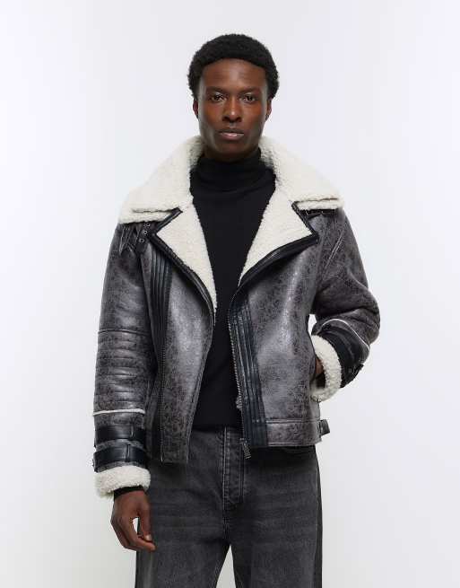 River Island crackle faux shearling aviator jacket in gray